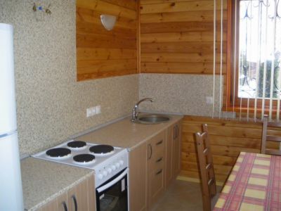 Дом и баня из калиброванного бревна, забор с кирпичными столбами. Внутренняя отделка из материалов заказчика.