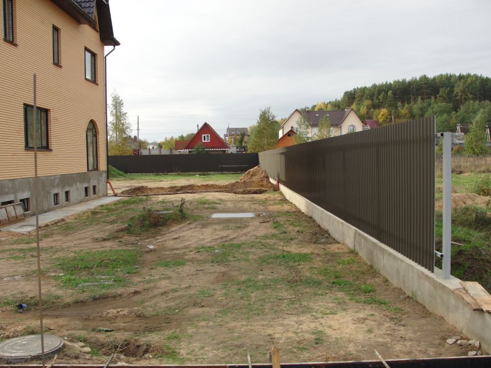 планировка,заливка опорной стенки,кладка кирпичных столбов, монтаж забора из профлиста.(далее изготовление кованных ворот с калиткой )........